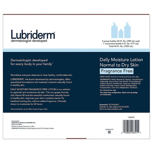 Lubriderm Daily Moisture Lotion, Fragrance Free 24 fl oz, 2-count + 6 fl oz Travel Size